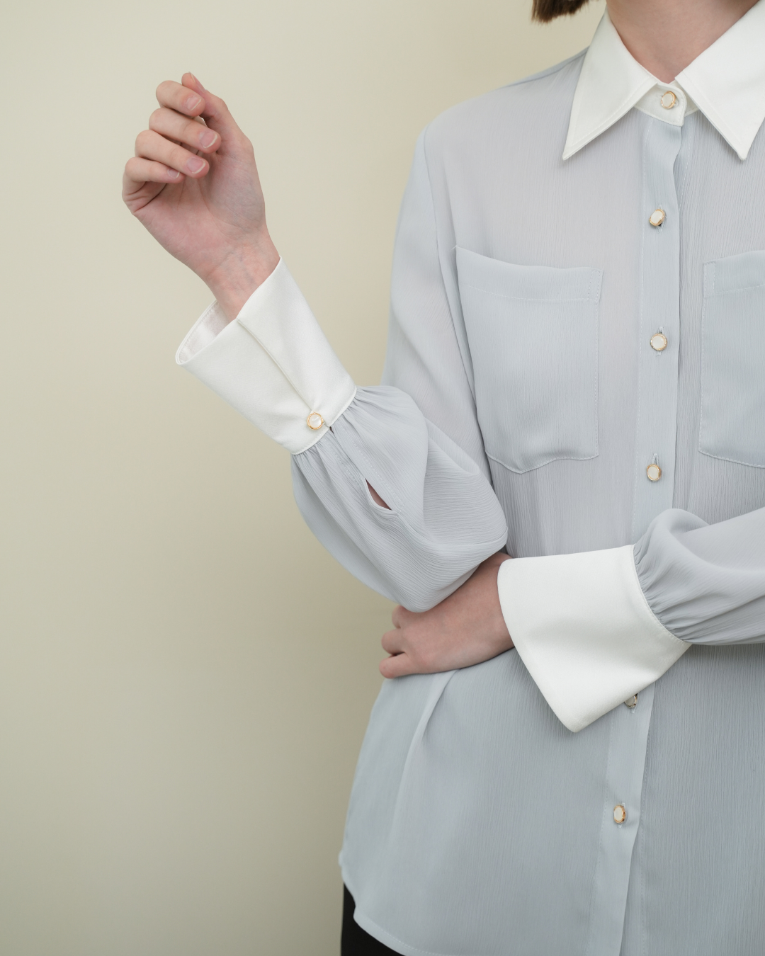 smart open cuffs and pearl accent buttons. Dressed up or down, it will work overtime in your capsule; just undo the buttons for a more casual look.