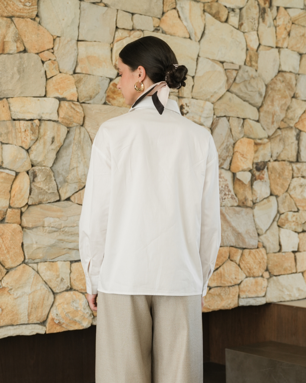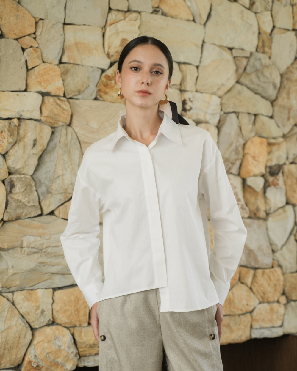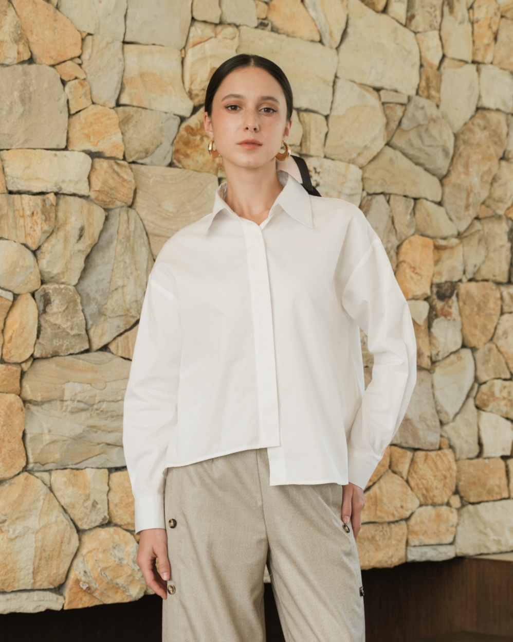Prilly shirt reimagines the classic white shirt with a touch of quiet boldness through its loose fit and asymmetric hemline longer on one side, creating a soft, flowing shape that adds movement and depth. Designed to be worn untucked, this subtle detail becomes the highlight of the look, offering a fresh silhouette that feels both effortless and intentional. Made from a lightweight, comfortable cotton that drapes naturally, Prilly is perfect for those who love timeless pieces with an unexpected twist.