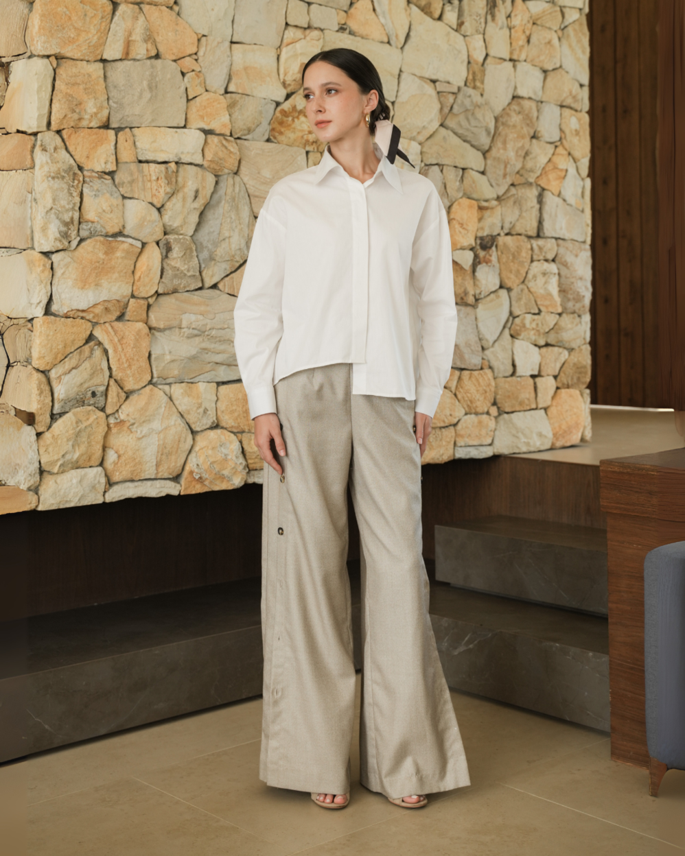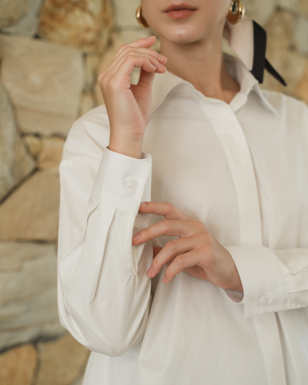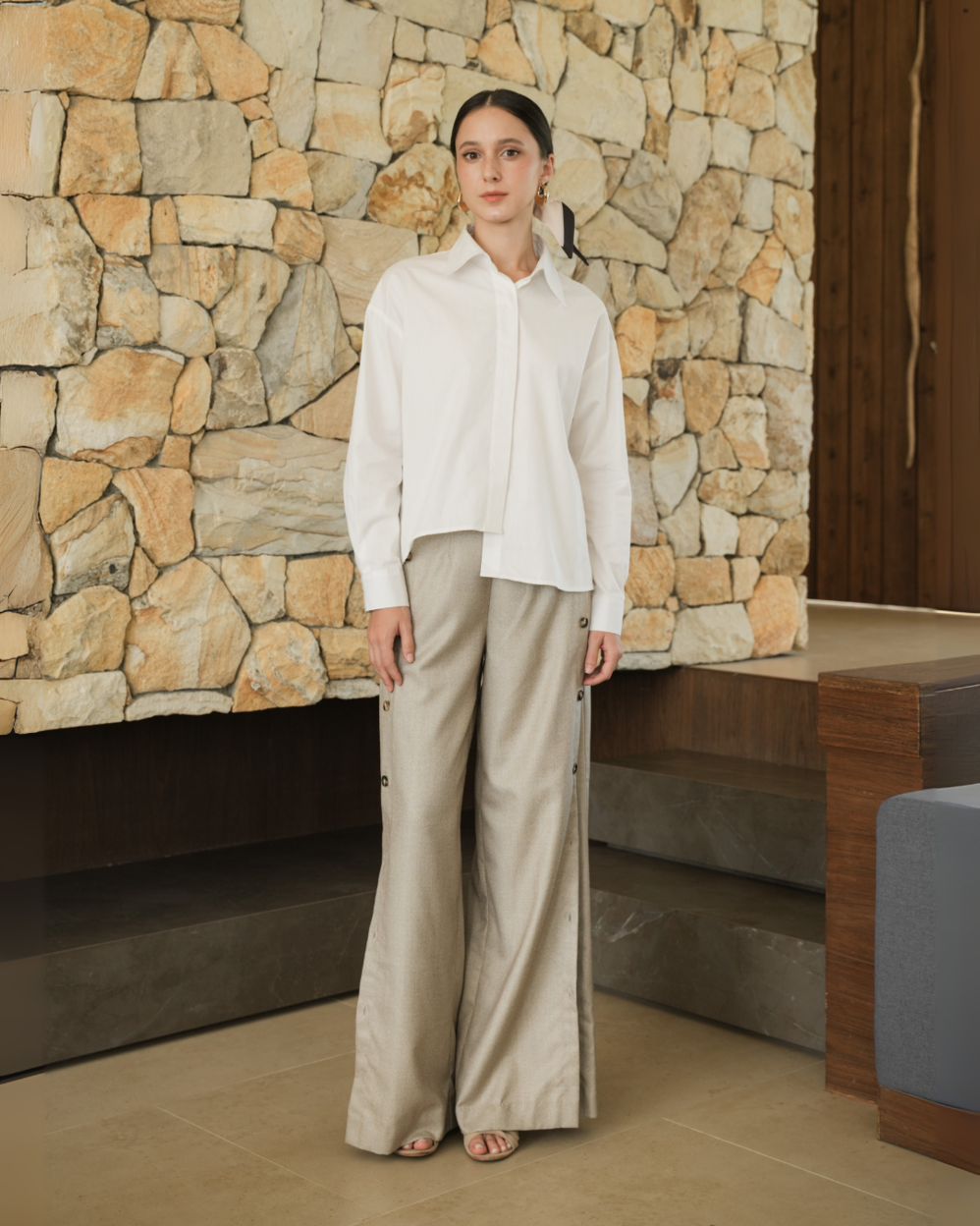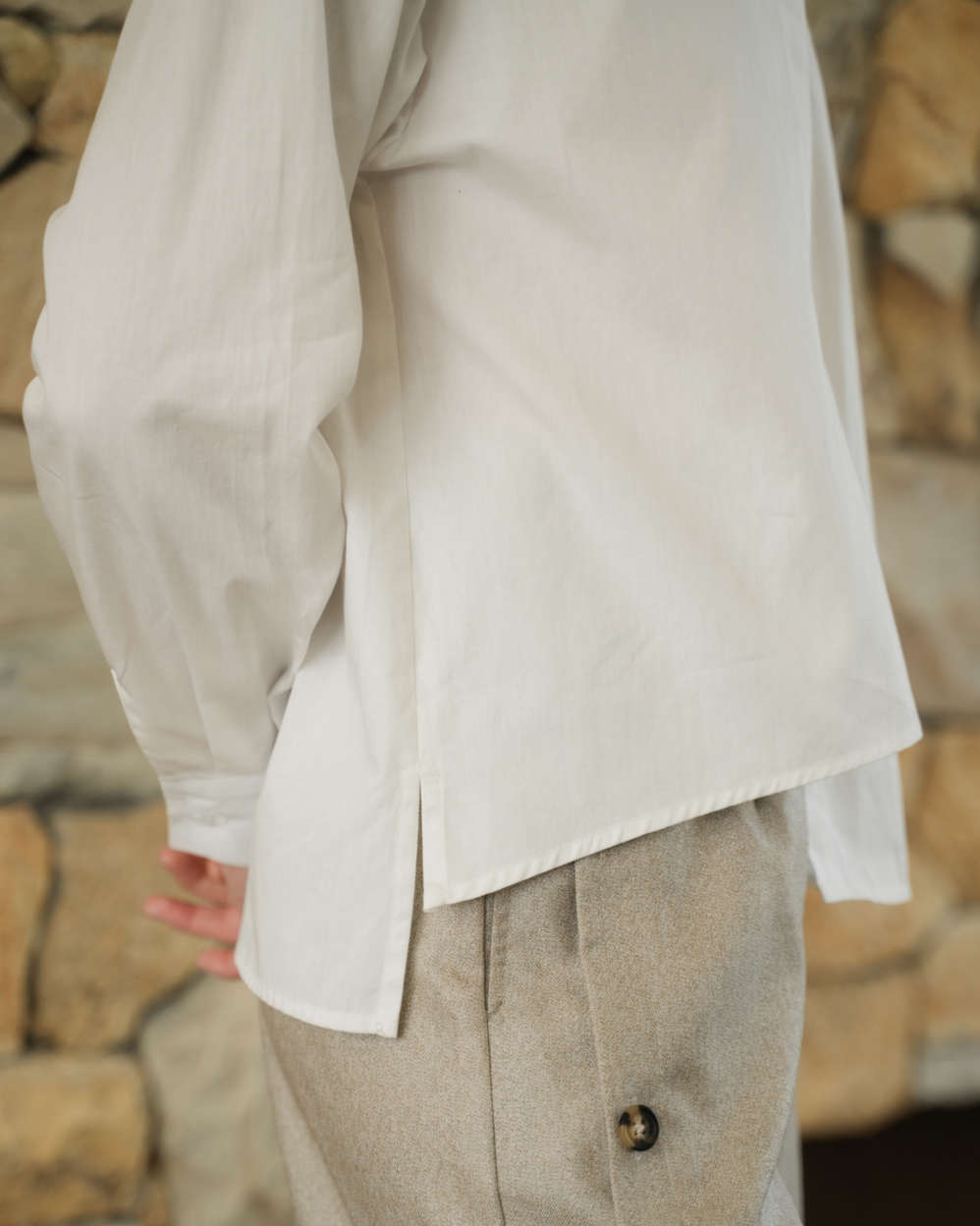 Prilly shirt reimagines the classic white shirt with a touch of quiet boldness through its loose fit and asymmetric hemline longer on one side, creating a soft, flowing shape that adds movement and depth. Designed to be worn untucked, this subtle detail becomes the highlight of the look, offering a fresh silhouette that feels both effortless and intentional. Made from a lightweight, comfortable cotton that drapes naturally, Prilly is perfect for those who love timeless pieces with an unexpected twist.