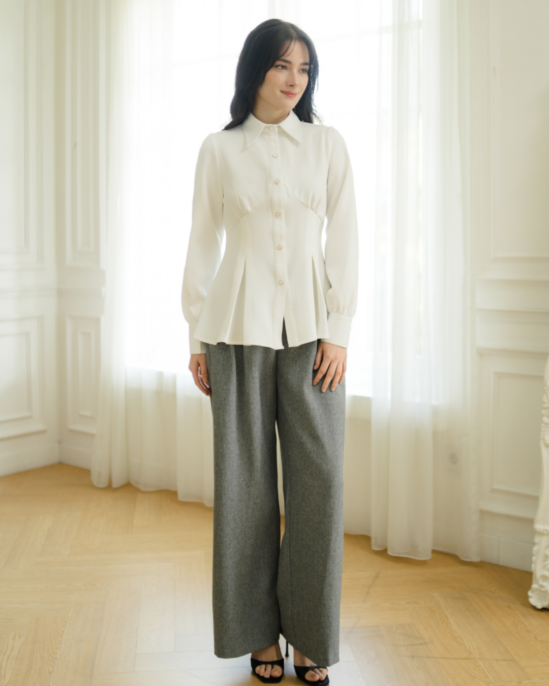 cut at the top flows into a beautifully pleated peplum at the waist, creating a feminine and structured silhouette. Completed with a classic collar and soft, voluminous long sleeves, it adds a