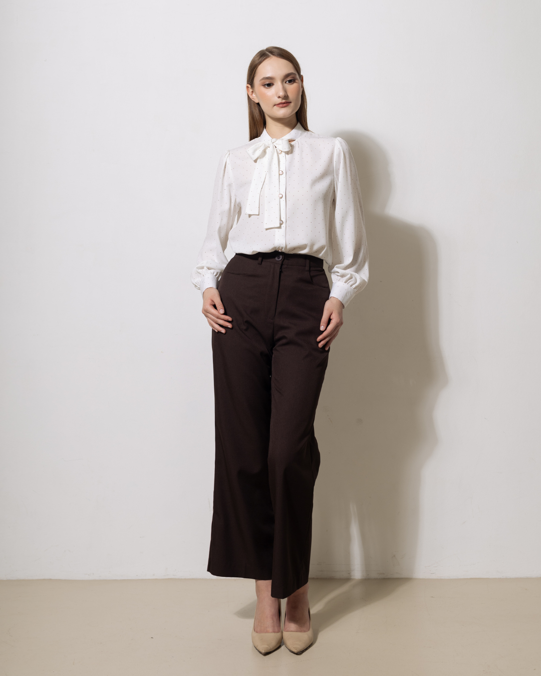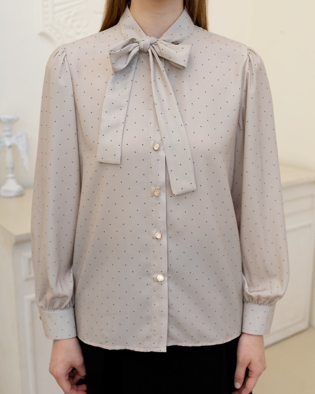 The INVIO Solanna Blouse features a delicate fabric adorned with a polkadot pattern. The defining feature is the elegant necktie, which can be styled into a neat, refined bow or left loosely tied for a relaxed, flowing, and polished feel. Long, gently voluminous sleeves gather into neat,
