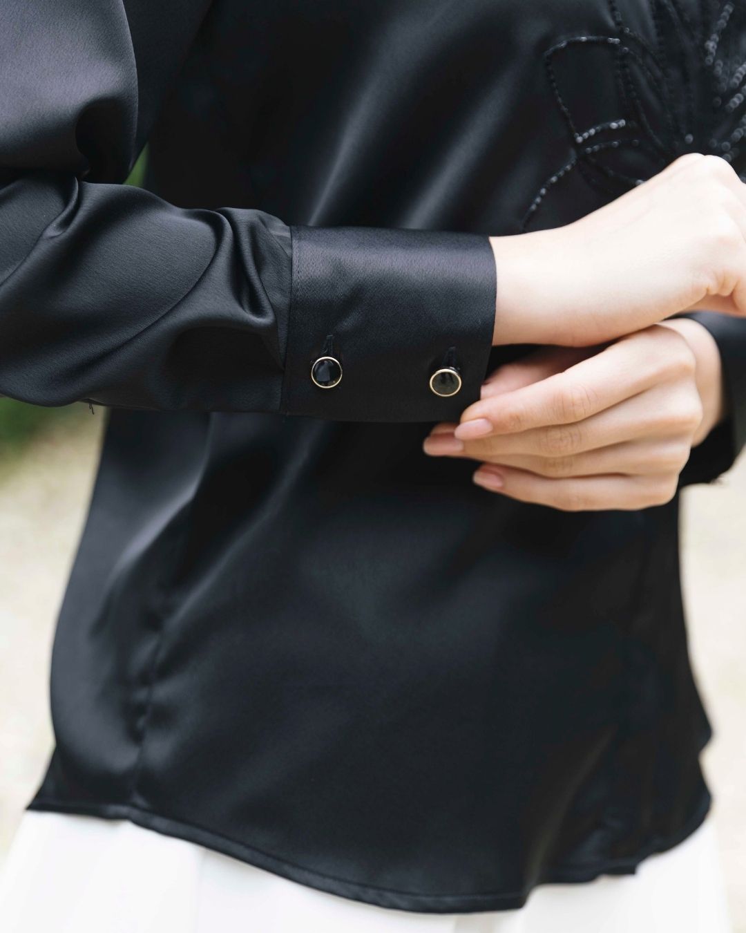 Crafted from smooth black satin, Tawney Blouse radiates subtle sophistication with its hand-embroidered floral motif at the center, delicately adorned with shimmering black beads. The hidden button placket keeps the look clean and refined, while the soft drape of the satin gently follows the silhouette. Elegant yet effortless, it is a timeless piece that embodies quiet confidence and modern grace.