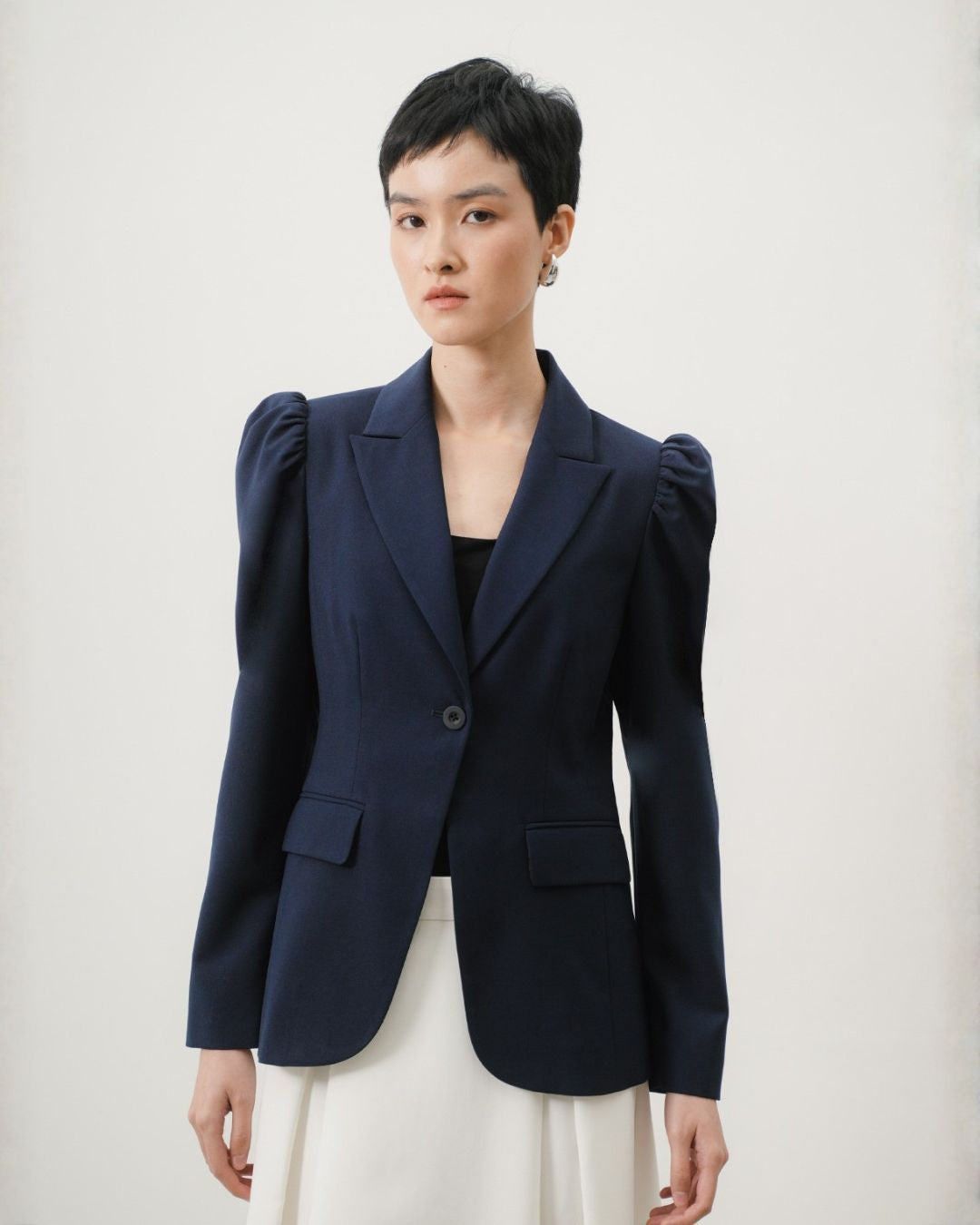 Varena Blazer is designed with a slim-fit silhouette, featuring softly structured puffed shoulders that add a subtle statement to a classic blazer form with a single button closure. Precise tailoring ensures a polished and refined appearance, while clean lines enhance the contemporary aesthetic, this blazer offers effortless styling options and delivers a confident, elevated statement. Suitable for both workwear and smart casual occasions, Varena Puff Shoulder Blazer balances modern design with timeless sophistication.