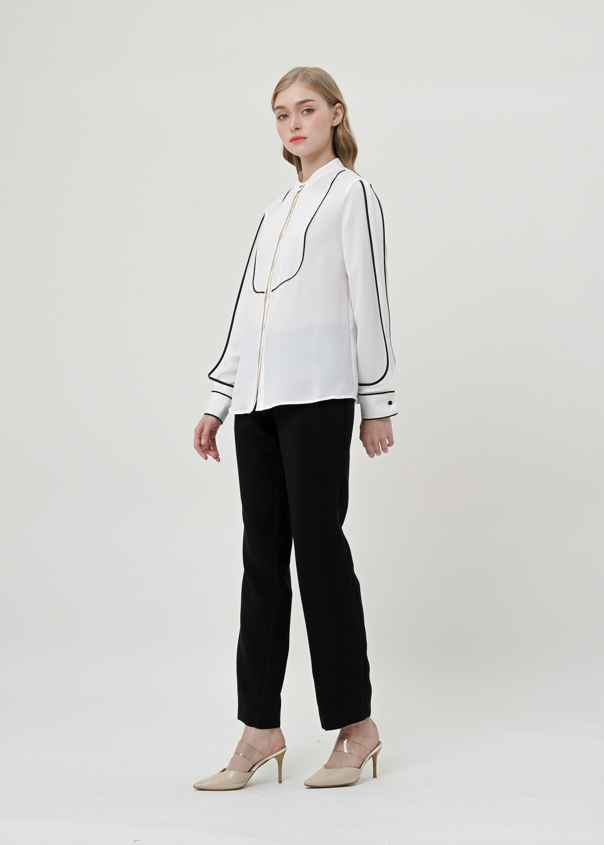 Taking on a fluid construction, Paula Blouse features a hidden front button fastening, long sleeves with cuffs, and an intricate panel constructed along the hands. It is made of a premium non-see through fabric in white with an all-around contrasting piped-trim design.
